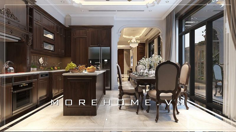 Mẫu tủ bếp gỗ óc chó cao cấp có thiết kế đường nét hoa văn tân cổ điển tinh tế, tạo ra không gian phòng bếp ấn tượng khi kết hợp với các thiết bị bếp hiện đại giúp người nội trợ có được sự tiện nghi.