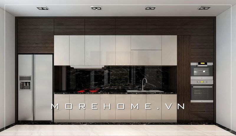 Mẫu tủ bếp có màu trắng tân cổ điển với chữ i đẹp mắt sẽ là lựa chọn tuyệt vời cho phòng bếp của biệt thự.